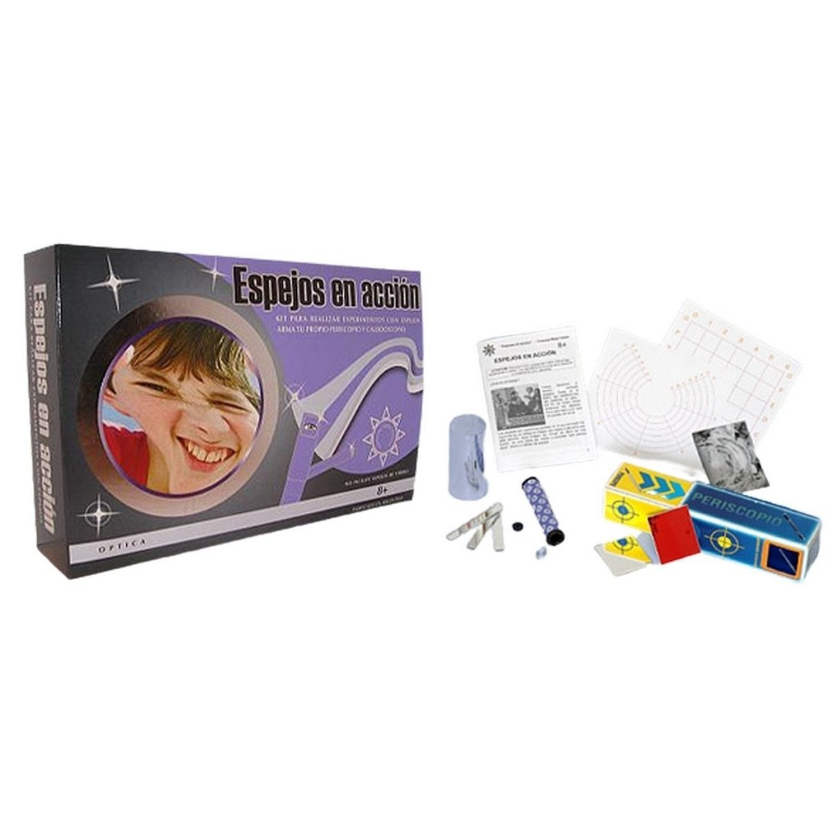 Kit para realizar experimentos con espejos, armar tu propio periscopio y caleidoscopio. Los espejos que contiene no son de vidrio. Realiza experimentos para deformar imágenes, volverlas a componer, etc.